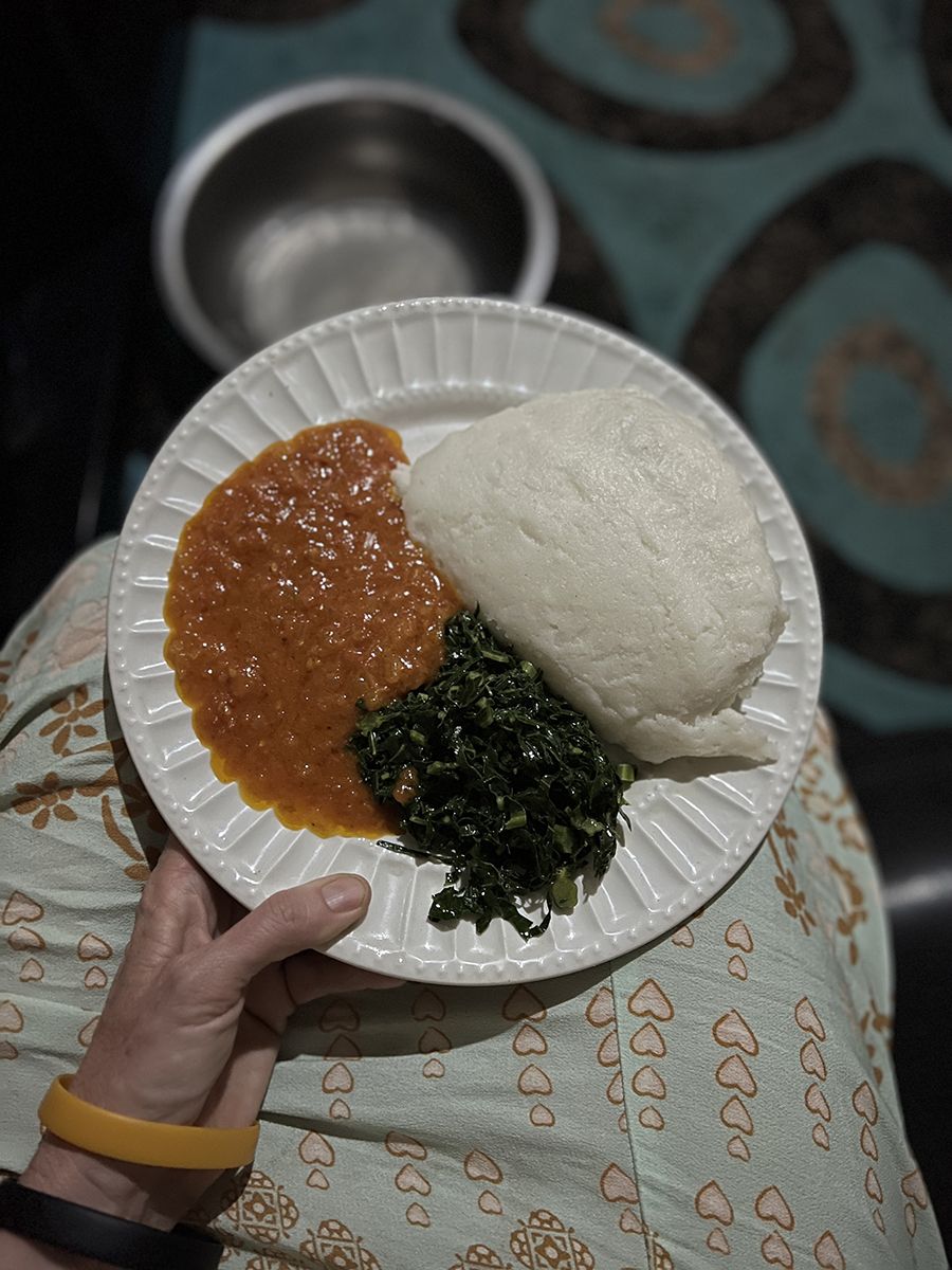 Sadza with green vegetables and tomato ‘soup’. The food filled my belly, but didn’t deeply satiate me the way that my diet at home does.
